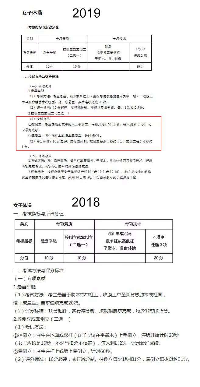 2019年《评分标准》与2018年相比,部分项目有所改动,请各位体育生注意。这里通过体操和滑水两个项目的变化对比,简单了解一下。