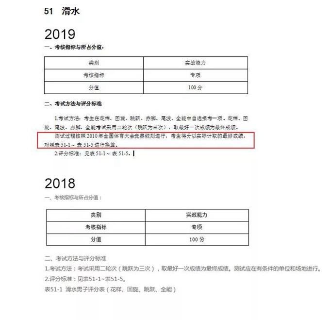 上图是滑水项目,几乎没有变动,只是2019年的标准里对于考试使用的规则给出了明确的要求。