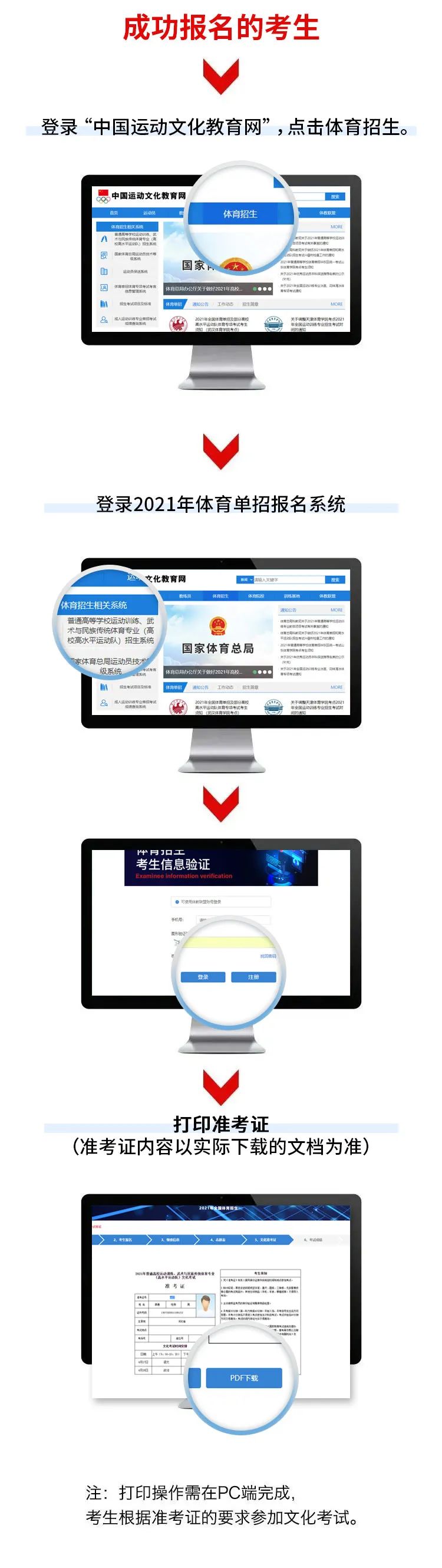建议:体育单招考生、优秀运动员保送考生均可下载PDF文件进行保存后,再打印准考证,即便准考证丢失也可再次打印。
