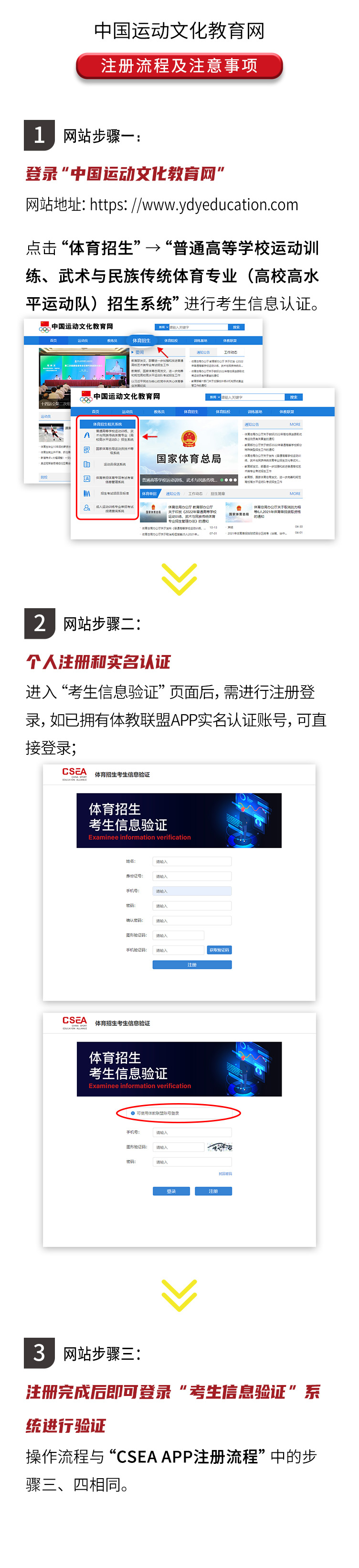 考生的信息注册验证工作将统一在“中国运动文化教育网”(www.ydyeducation.com)或“体教联盟APP”中“普通高等学校运动训练、武术与民族传统体育专业招生系统”内完成。