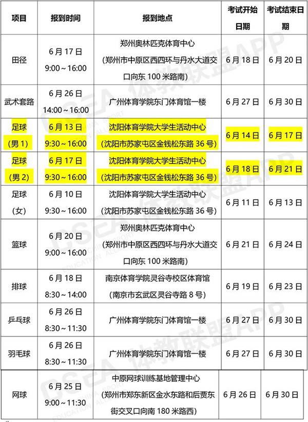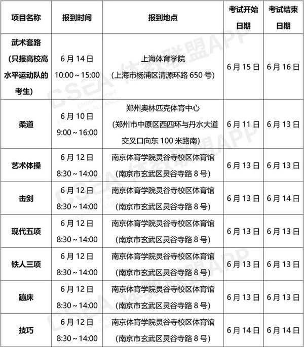 田径、足球、篮球、排球、乒乓球、羽毛球、网球和武术套路项目根据招生院校所在地进行分区域统考,考生按照一志愿报名院校所在区域参加考试,具体安排如下: